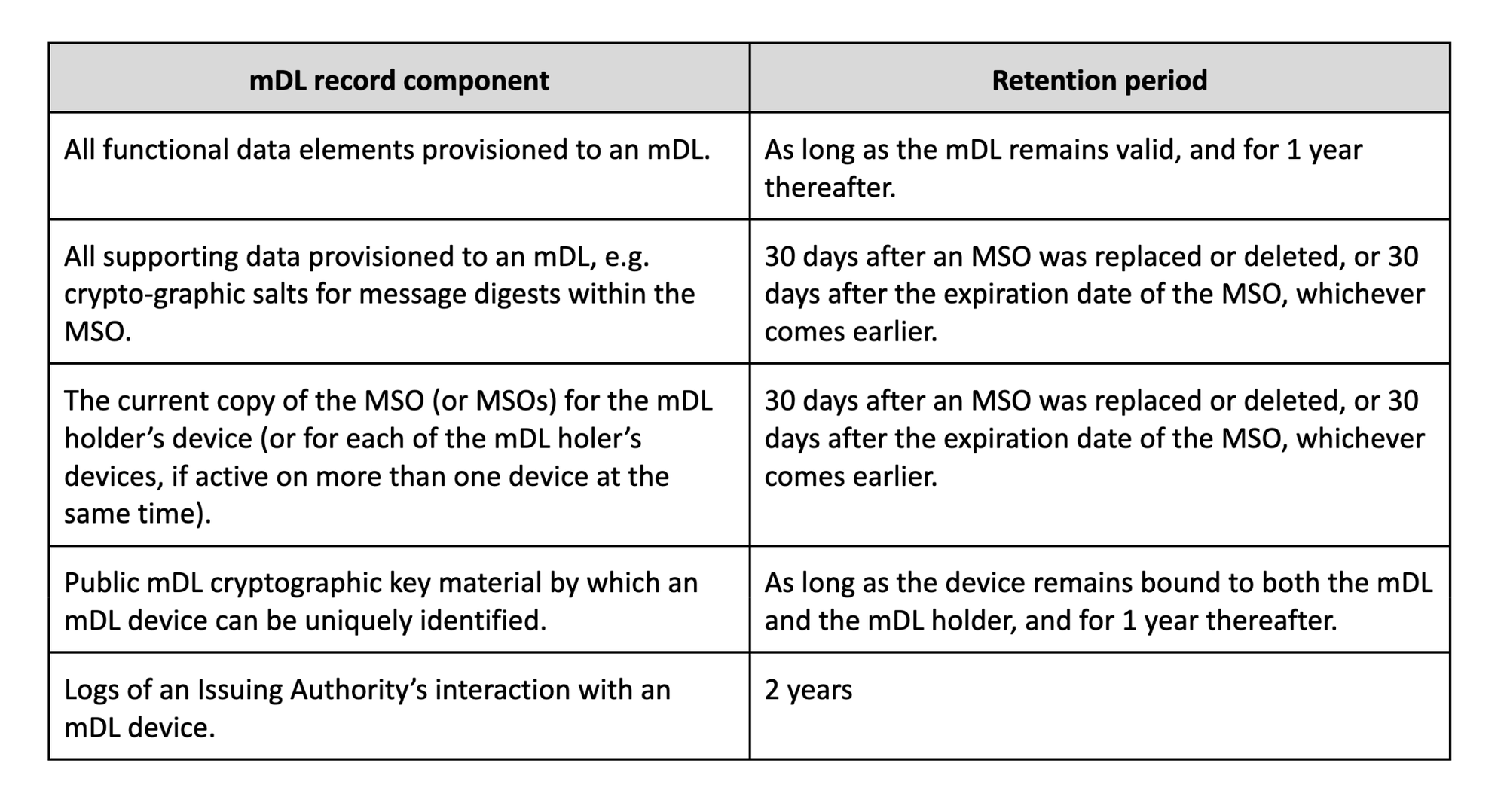 Another consideration is that certain implementation guidelines for digital credentials recommend retention periods for unique values for issuing authorities. For example, AAMVA’s implementation guidelines include the following recommendations for minimum retention periods: