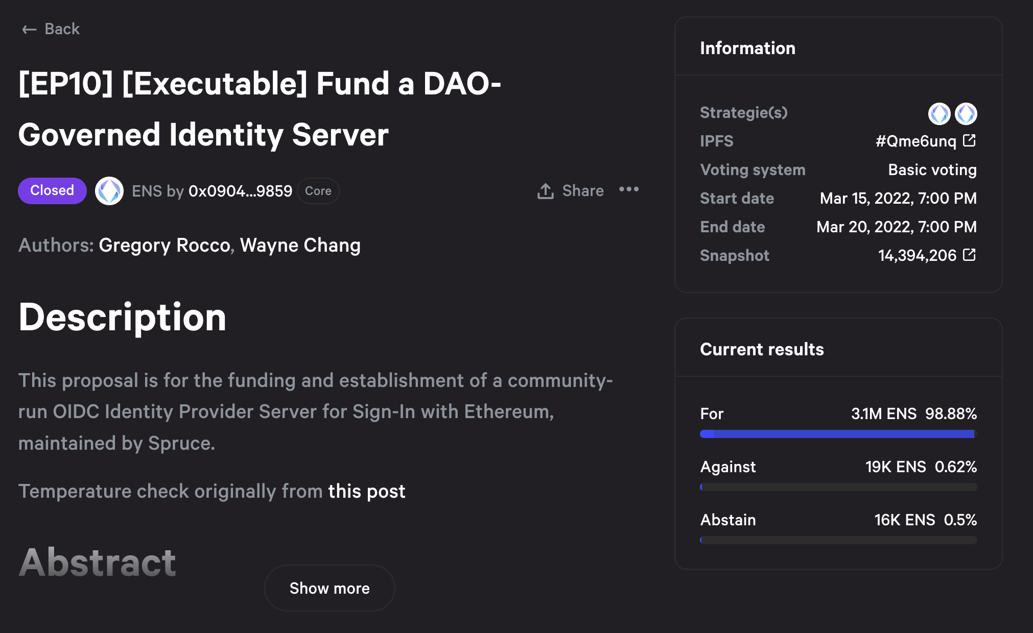 We believed that the ENS DAO would be the best credibly-neutral organization to be the host of this infrastructure. A community subgroup could be created in order to maintain the authorizations and access to the server, and contract one or multiple entities to maintain it. Additionally, ENS and its community would benefit from increased adoption of Sign-In with Ethereum due to the enablement of organizations to use ENS as a core touchpoint for a user’s basic identity and information (via ENS profiles).