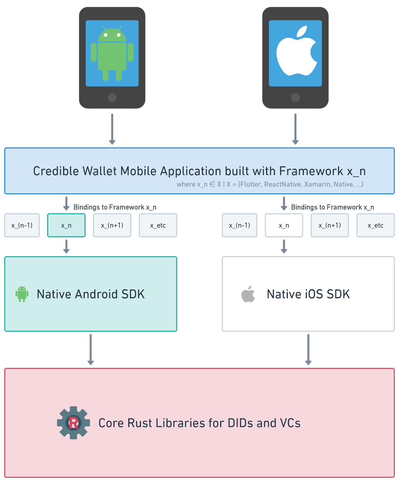 Despite the design choices for our reference app, Credible’s modular architecture still allows it to be used with React Native, Xamarin, pulled in as an SDK to fully native applications, and to augment live applications with active users by adding DID/VC functionality. The high level architecture of Credible is as follows: