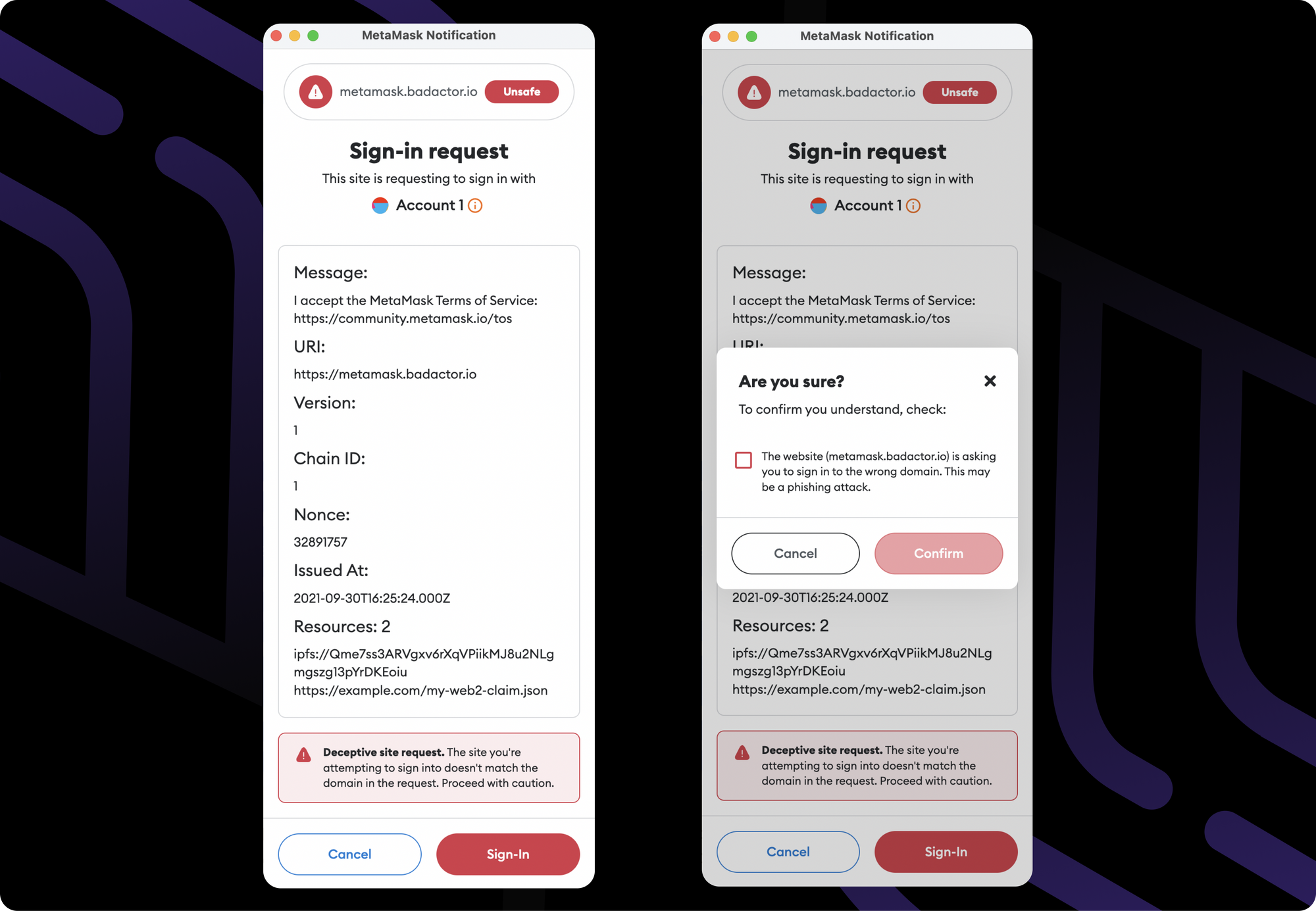 Another prominent feature of this integration that improves user safety in Web3 is domain binding. Domain binding is present to make sure users don't become the victim of phishing attacks when sites ask users to sign in, but the message doesn’t match the website they’re actually on. If this happens, the user is prompted with a warning and they must explicitly select to move ahead, accepting the risks of a potential phishing attack.
